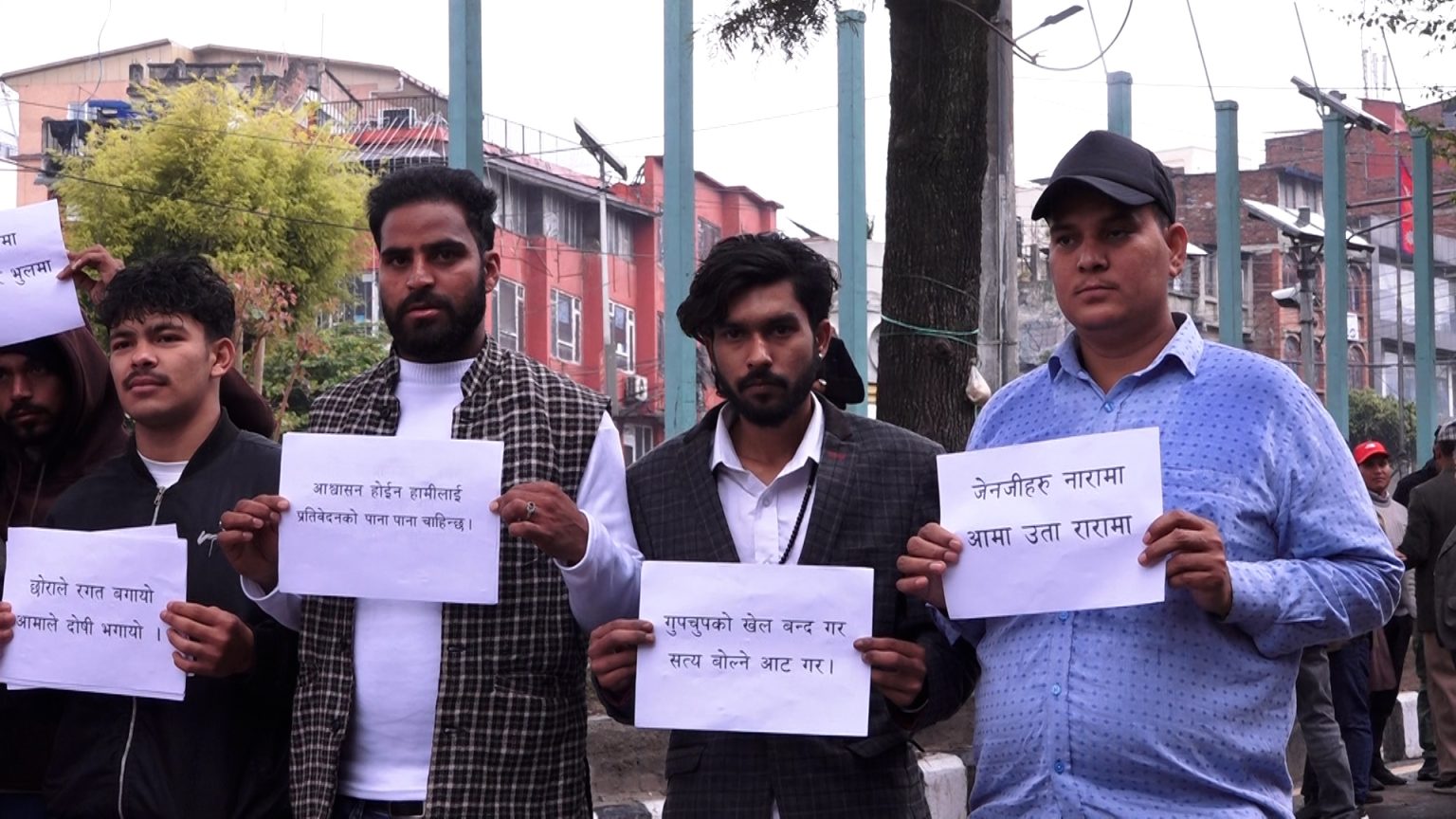 उनीहरूले ‘जेनजी आन्दोलन खोलामा’, ‘प्रतिवेदन झोलामा’, ‘जेनजीहरू नारामा ,आमा रारामा’ तथा ‘कार्की आयोगको प्रतिवेदन तुरून्त सार्वजनिक गर’ लगायतका प्ले कार्ड बोकेर प्रदर्शन गरेका हुन् ।